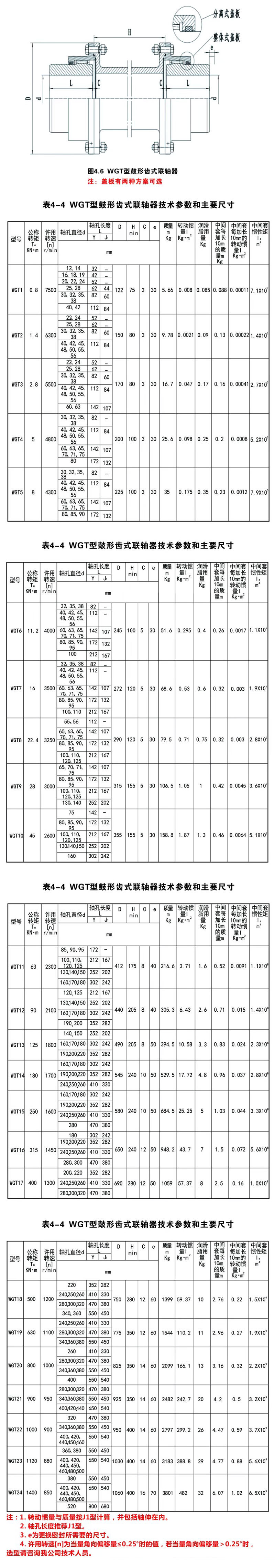 WGT接中间套型鼓形齿式联轴器,适用于长距离联接的场合,结构型式见图4.6,技术参数和尺寸参数见表4-4
